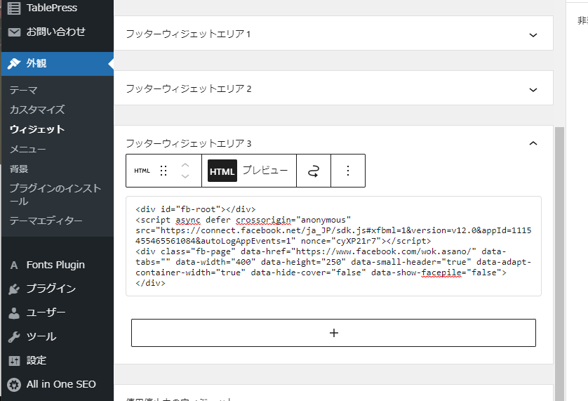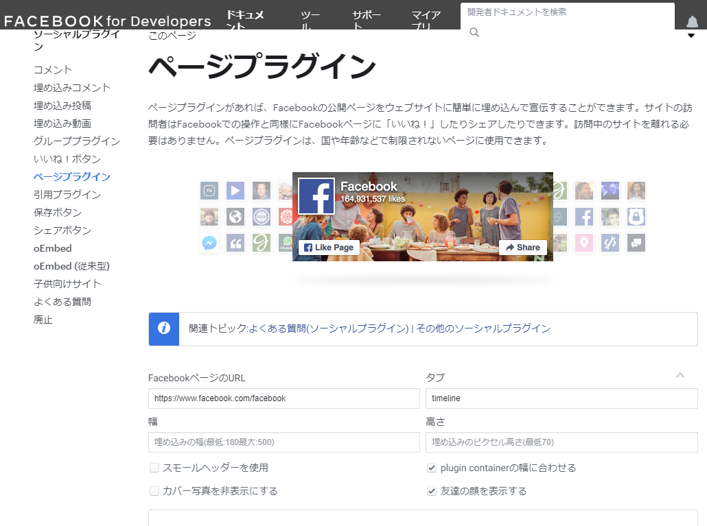 Facebookのページをwordpressに埋め込む方法(メモ) 2021年9月16日 最終更新日時 : 2021年9月17日 asano3 埋め込めるのは”ページ” Facebookページプラグイン にアクセスする Facebookページプラグイン 参考URLhttps://relation-blogseo.com/%E3%83%AF%E3%83%BC%E3%83%89%E3%83%97%E3%83%AC%E3%82%B9-facebook-%E3%83%9A%E3%83%BC%E3%82%B8-%E3%83%97%E3%83%A9%E3%82%B0%E3%82%A4%E3%83%B3-%E8%A8%AD%E7%BD%AE/#Facebook-5